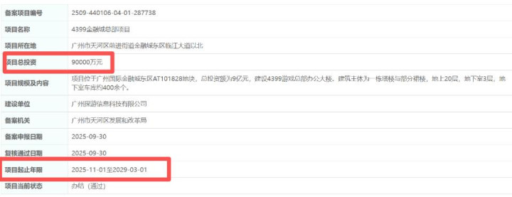 项目将建设一栋地上20层、地下3层的塔楼及部分裙楼,总计容建筑面积约4万平方米,地下室规划有400余个车位。项目总投资额高达9亿元,由4399的全资子公司广州探游信息科技有限公司负责建设。