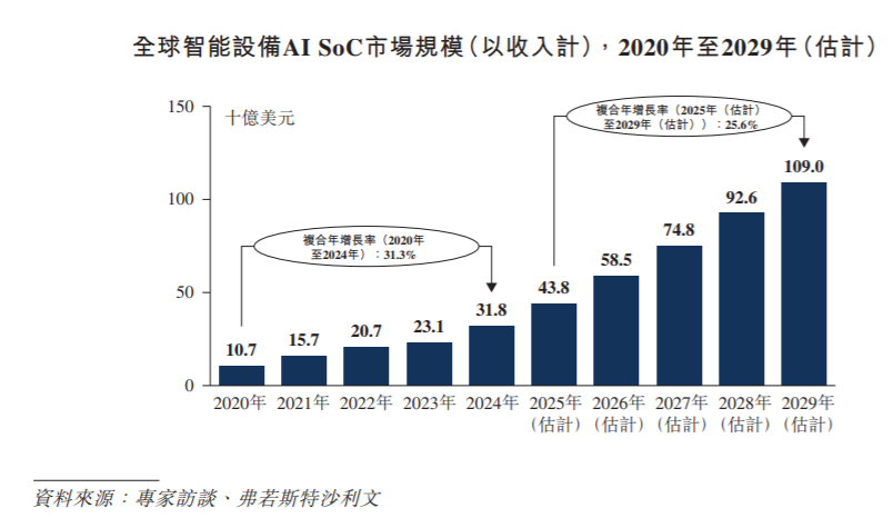 以收入计,全球智能设备AI SoC市场规模由2020年的107亿美元增长至2024年的318亿美元,2020年至2024年的复合年增长率达到31.3%。预计至2029年,全球智能设备AI SoC市场规模将进一步由2025年的438亿美元增长至1090亿美元,2025年至2029年的复合年增长率将达到25.6%。从发展趋势来看,随著AI在智能设备中的应用持续深化,智能设备AI SoC未来有著十分广阔的发展前景。