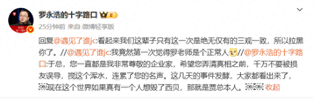 15日,罗永浩也转发了媒体关于于东来谈西贝事件的文章,并表示:“于总,您一直都是我非常尊敬的企业家,希望您弄清真相之前,千万不要被损友误导,搅这个浑水,连累了您的名声。这几天的事件发酵,大家都看出来了,现在这个世界如果真有一个人想毁了西贝,那就是贾总本人。”